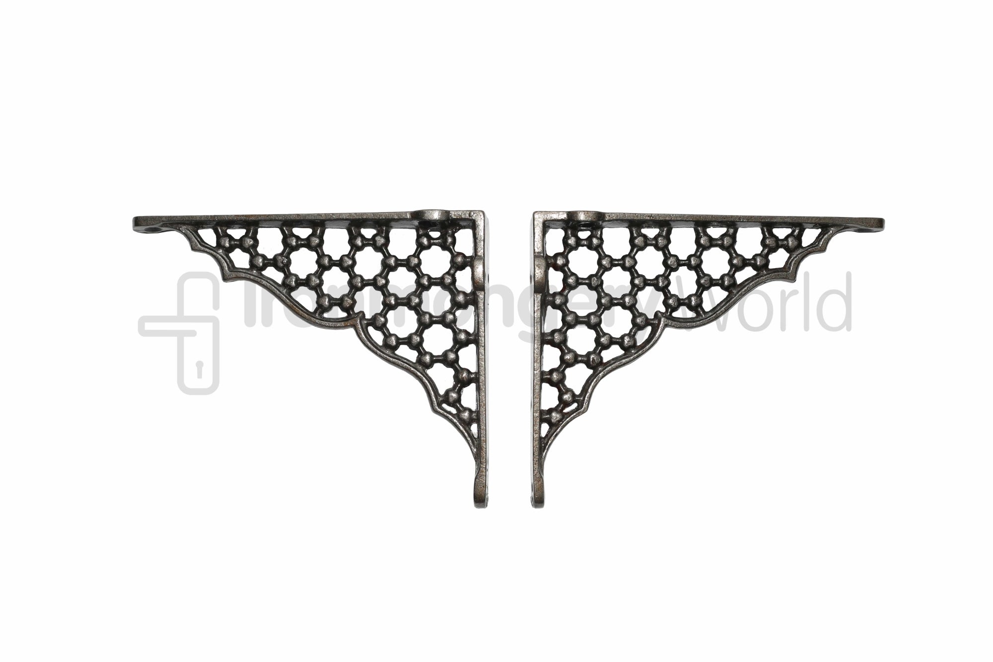 Paire de supports d'étagères en treillis Jali « 6 » en fer antique.