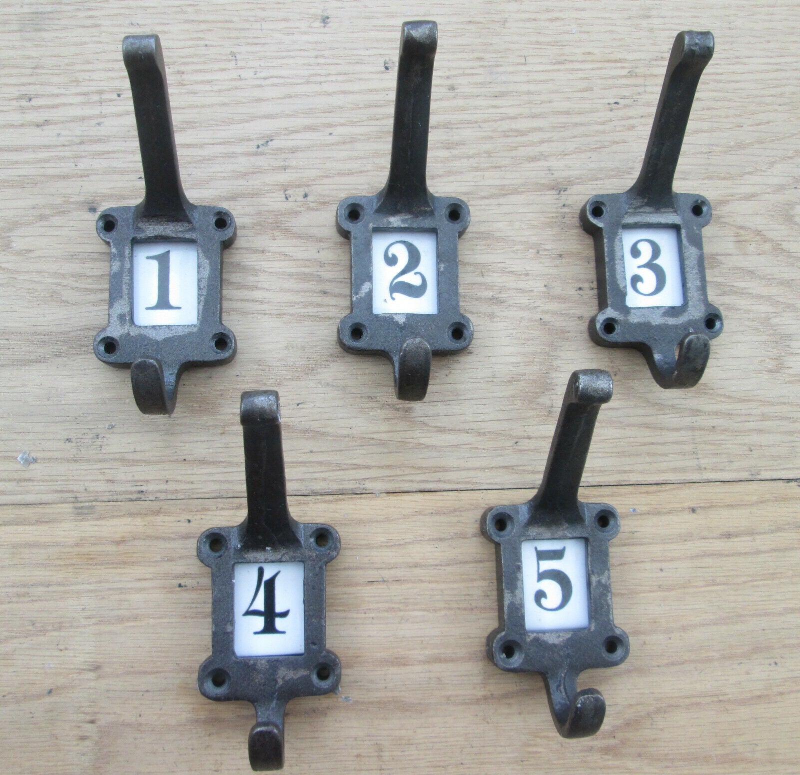 Patères en fer antique numérotées de 1 à 5 avec insert en céramique